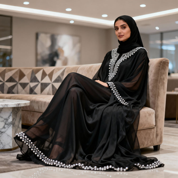 La soie de Médine, souvent associée aux abayas quotidiennes, trouve également sa place dans les tenues de soirée lorsqu'elle est travaillée avec des ornements appropriés.